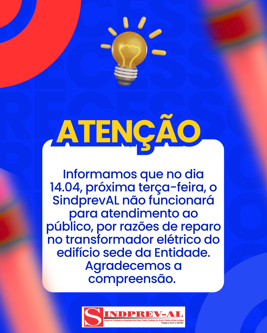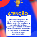 Informamos que no dia 14.04, próxima 3a feira, o SindprevAL não funcionará para atendimento ao público, por razões de reparo no transformador elétrico do edifício sede da Entidade. Agradecemos a compreensão.